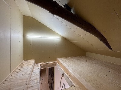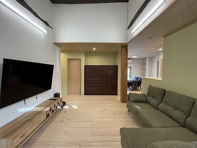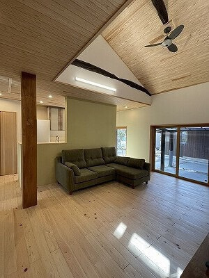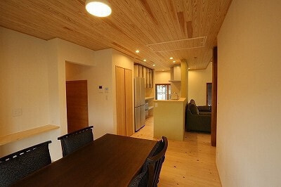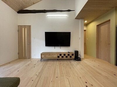 木造住宅/築80年/古民家リノベーション/内装 桧15mmフローリング 内装壁珪藻土 天井杉羽目板 APW樹脂サッシ キッチンクリナップSK 断熱化(床ウレタン吹付80㎜・天井セルロースファイバ250㎜) 防蟻処理 ・玄関ドア木製オーダー片引き戸