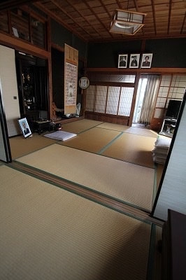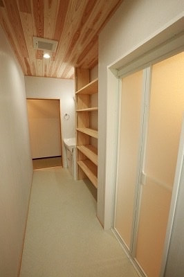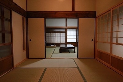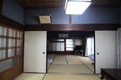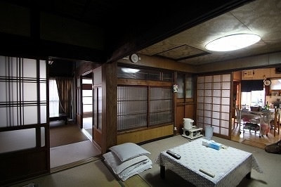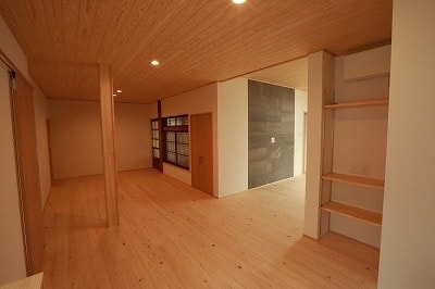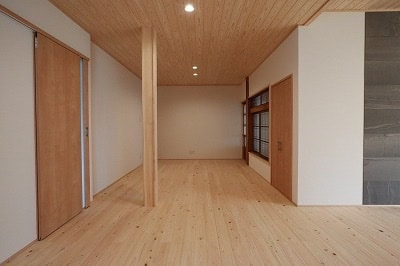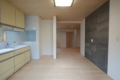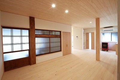 木造住宅/築70年/古民家リノベーション/内装 桧15mmフローリング 内装壁珪藻土 天井ヒノキ羽目板 APW樹脂サッシ キッチンタカラスタンダード 廊下畳 断熱化(床ウレタン吹付80㎜・天井セルロースファイバ300㎜) 防蟻処理 床下換気システム導入 ベレットストーブSS-5