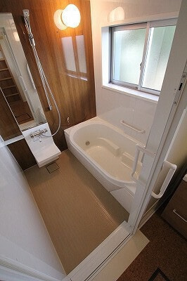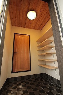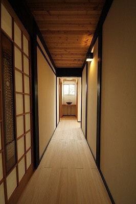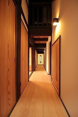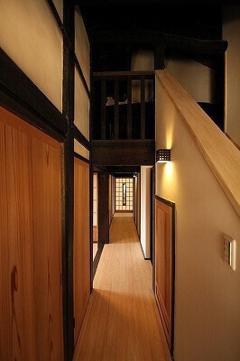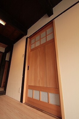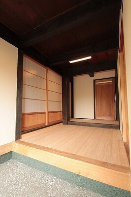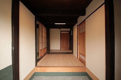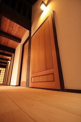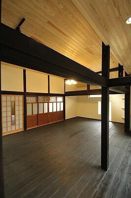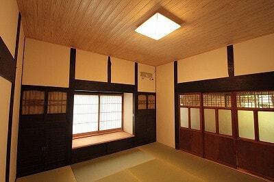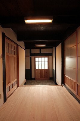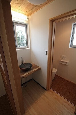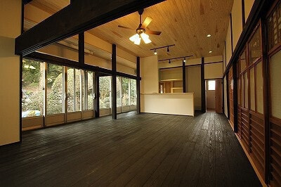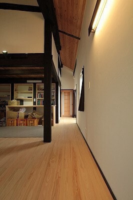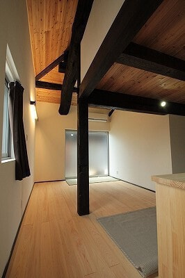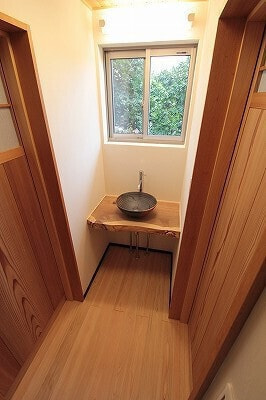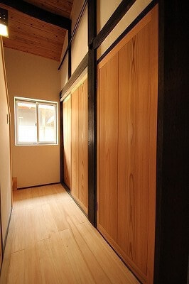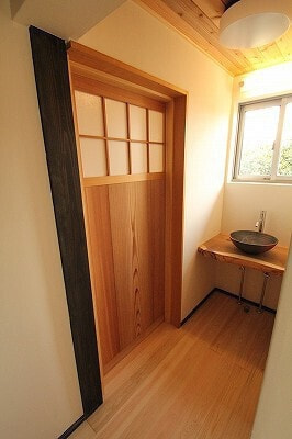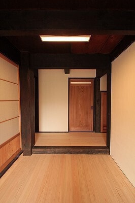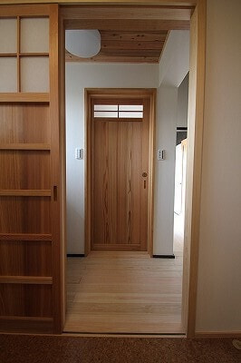 木造/築100年以上/古民家再生 ①LDK内装 床杉40mmフローリング 内装壁珪藻土(テラ・デコール) 天井杉板 キッチン取替え(ウッドワン)/②寝室 床桧無垢フローリング 内装壁珪藻土(テラ・デコール) ③和室 床ワラ床畳(熊本八代産イグサ使用) ④玄関ホール 床桧無節フローリング 内装壁珪藻土(テラ・デコール) ⑤トイレ・浴室・脱衣室 建替え ⑥中2階