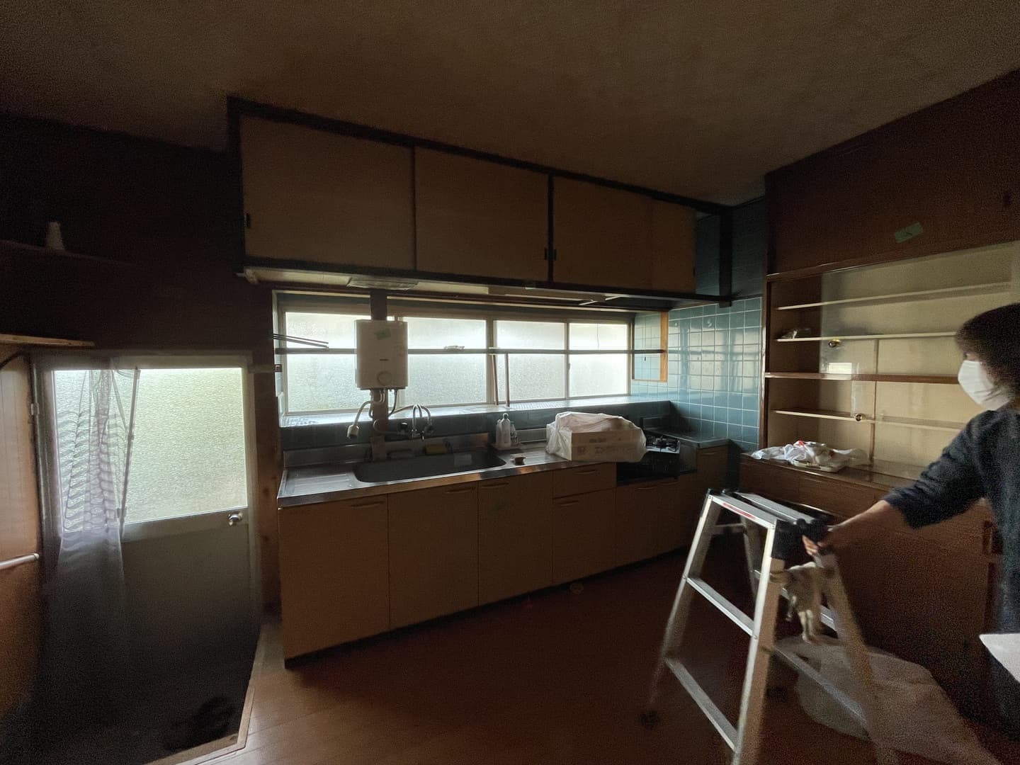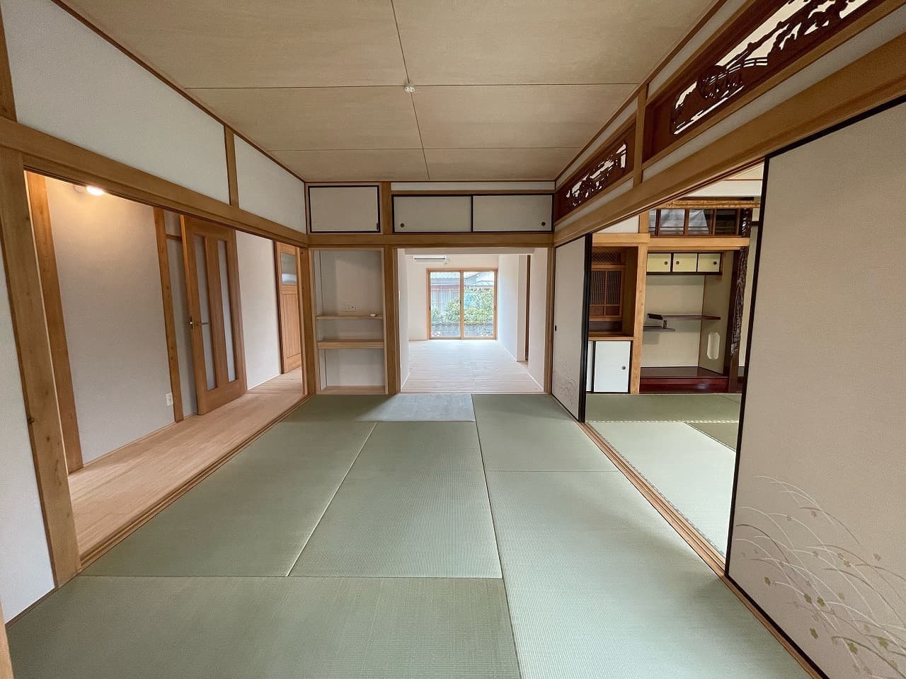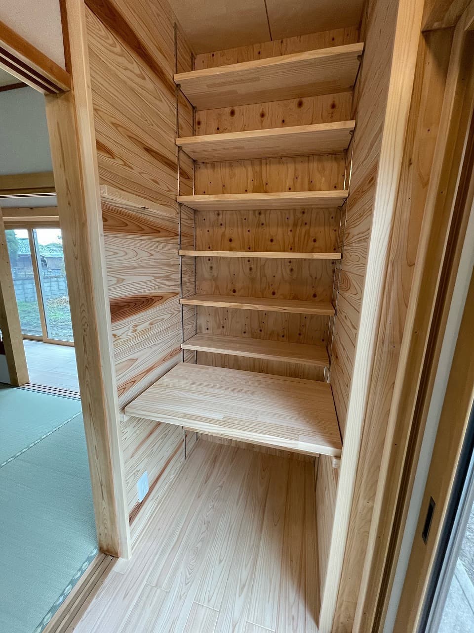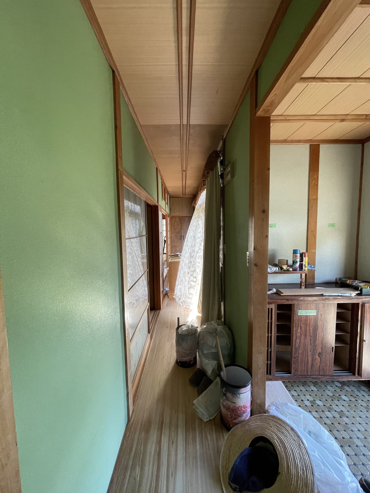 木造住宅/築46年/民家リノベーション/内装 桧15mmフローリング 内装壁珪藻土 天井杉羽目板/シナ合板 APW樹脂サッシ キッチンクリナップSK 断熱化(床ウレタン吹付80㎜・天井ウレタン吹付110㎜) 防蟻処理 ・玄関引戸 アウターシェード 合併浄化槽設置