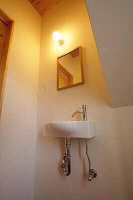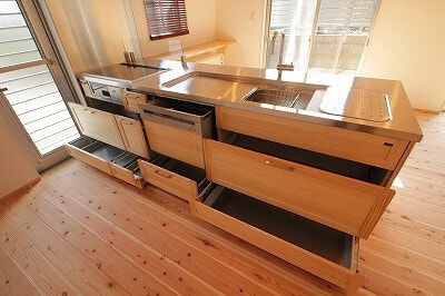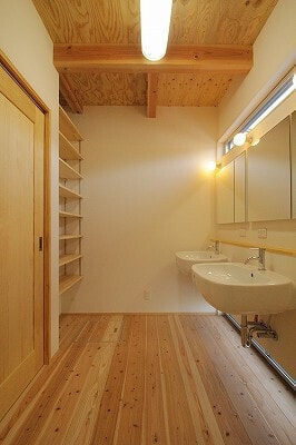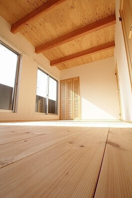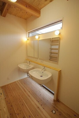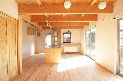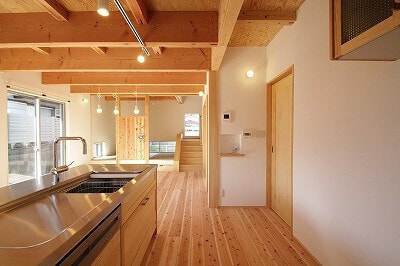 木造軸組みAPS工法/屋根ガルバ鋼板/外壁ガルバ金属サイディング/内装床1F杉厚板15㎜・2Fパイン厚板20mm/内装壁珪藻土テラ・デコール/内装天井合板表し/ワックス米ぬかベースのこめっとさん/サッシYKK複層/建具無垢ドア&施主支給品/システムバス長府/洗面台オリジナル/タンクレストイレ/木目調玄関ドア/無垢キッチン(ウッドワン・suiji)
